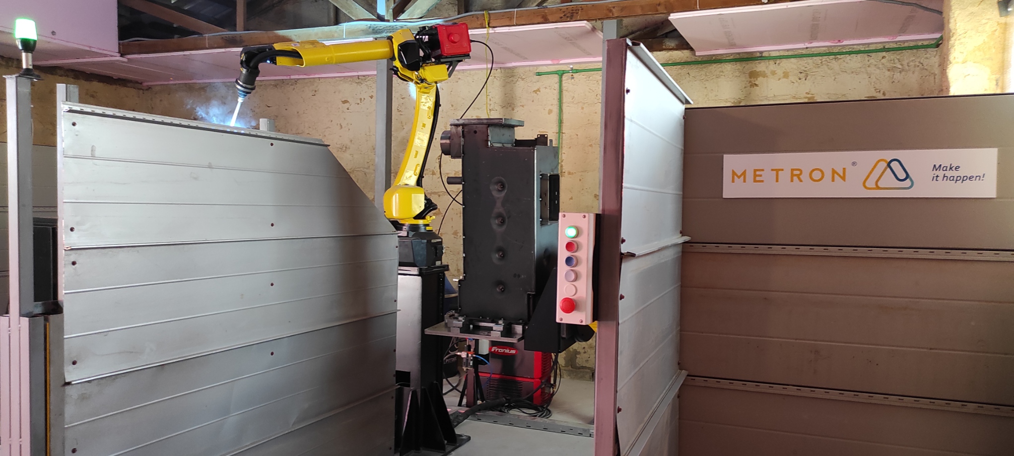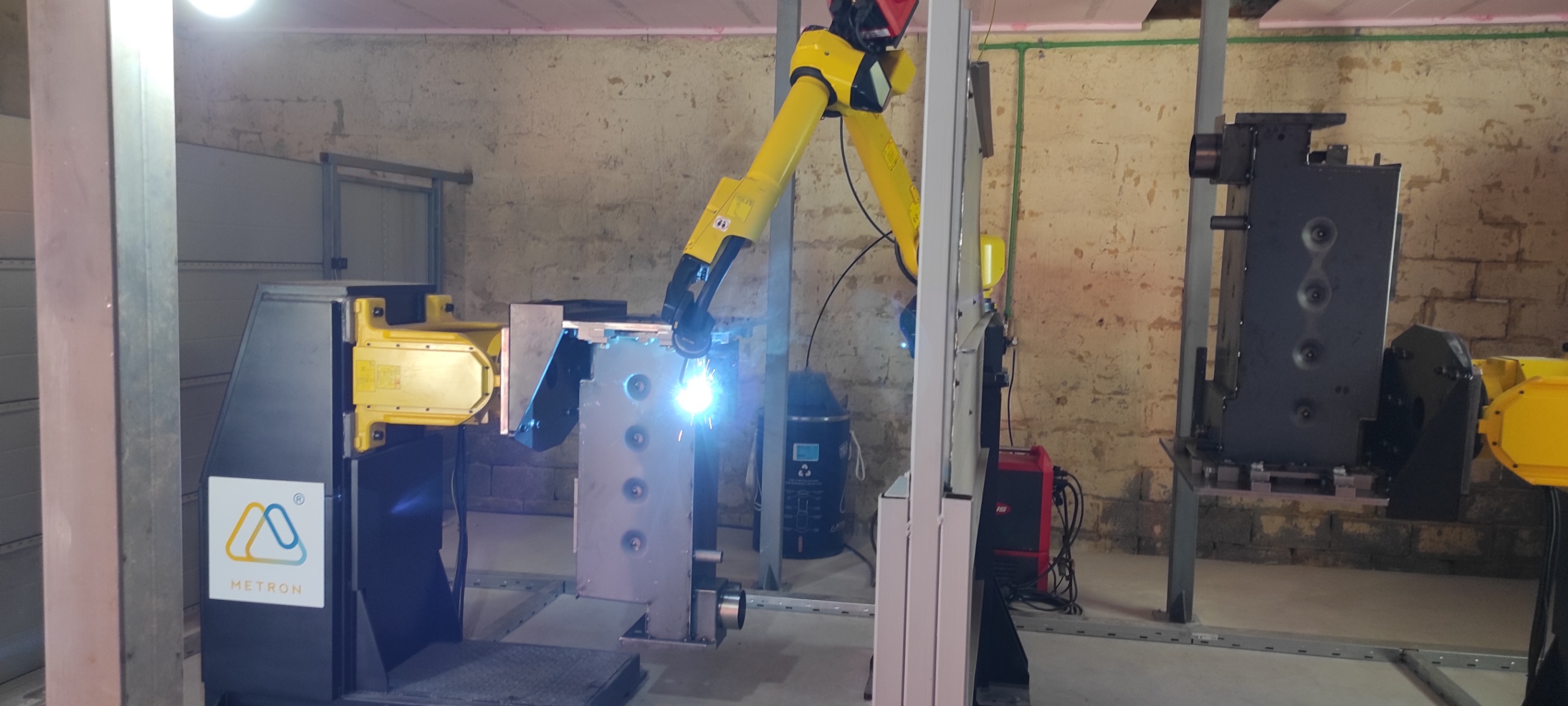 Realizovali smo projekat robotske ćelije za automatsko zavarivanje kotlova. Ovaj projekat uključuje robotsku ruku Fanuc 100id/8L na koju je pričvršćen pištolj za zavarivanje, dva dvoosna pozicionera na koja se postavljaju kotlovi i pregrade izmedju tih pozicionera. Pomenuti pozicioneri postavljeni su pod uglom od 90 stepeni u odnosu na robotsku ruku, tako da su sve pozicije na kotlovima lako dohvatljive. Ovaj koncept ćelije omogućava obavljanje više radnji istovremeno, tj. dok se s jedne strane proizvod zavaruje, operater je u mogućnosti da mijenja proizvod na drugoj strani. Ovakav način rada sistema osigurava efikasnost i veliku uštedu vremena.
